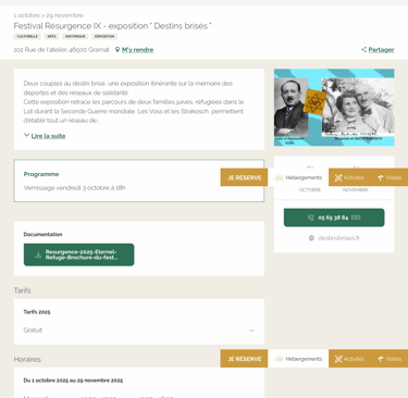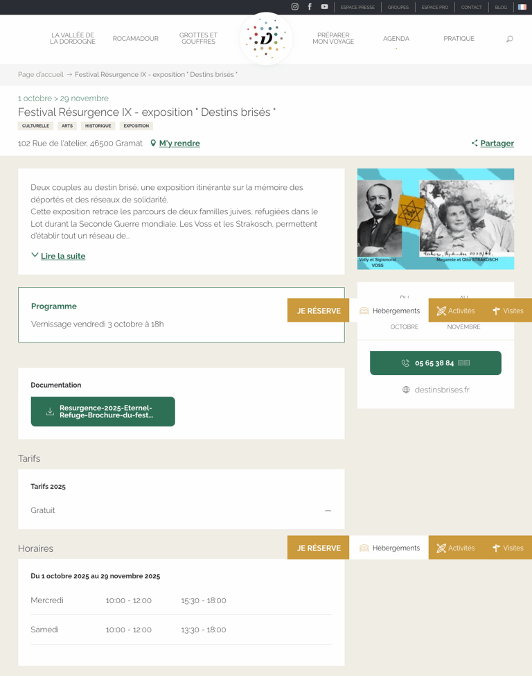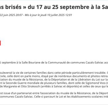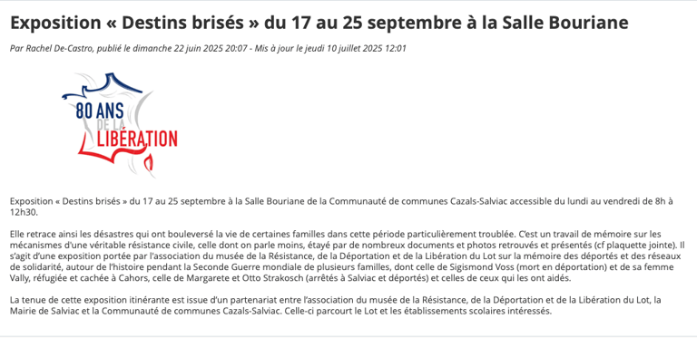 Depuis mars 2025, cette exposition « Destins brisés » est itinérante dans les communes et les établissements du Lot de la grande ruralité et suscite un intérêt croissant. Elle est prise en charge par M. Couderc, Président de l'Association du Musée de la Résistance, de la Déportation et de la Libération du Lot, secondé par des acteurs locaux, membres du Souvenir français ou de cercles d'histoire. En mai, elle est accueillie à Saint-Céré où l'équipe municipale s'est impliquée. Elle s'inscrit aussi dans les cérémonies de l'anniversaire de la fin de la guerre et de la libération des camps en 1945.