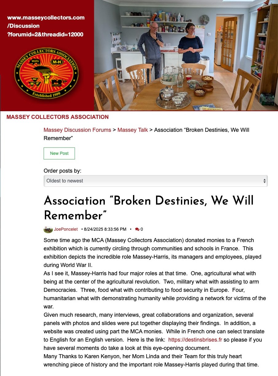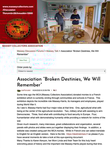 Il y a quelque temps, la MCA (Massey Collectors Association) a fait un don à une exposition française qui fait actuellement le tour des communautés et des écoles en France. Cette exposition illustre le rôle incroyable que Massey-Harris, ses dirigeants et ses employés ont joué pendant la Seconde Guerre mondiale.